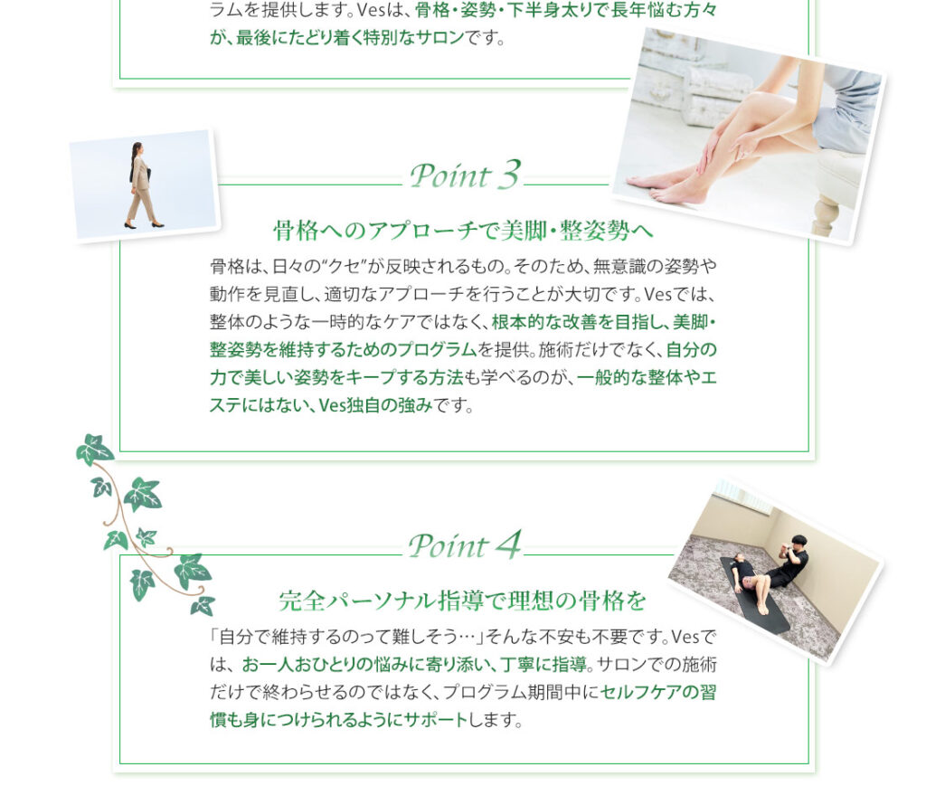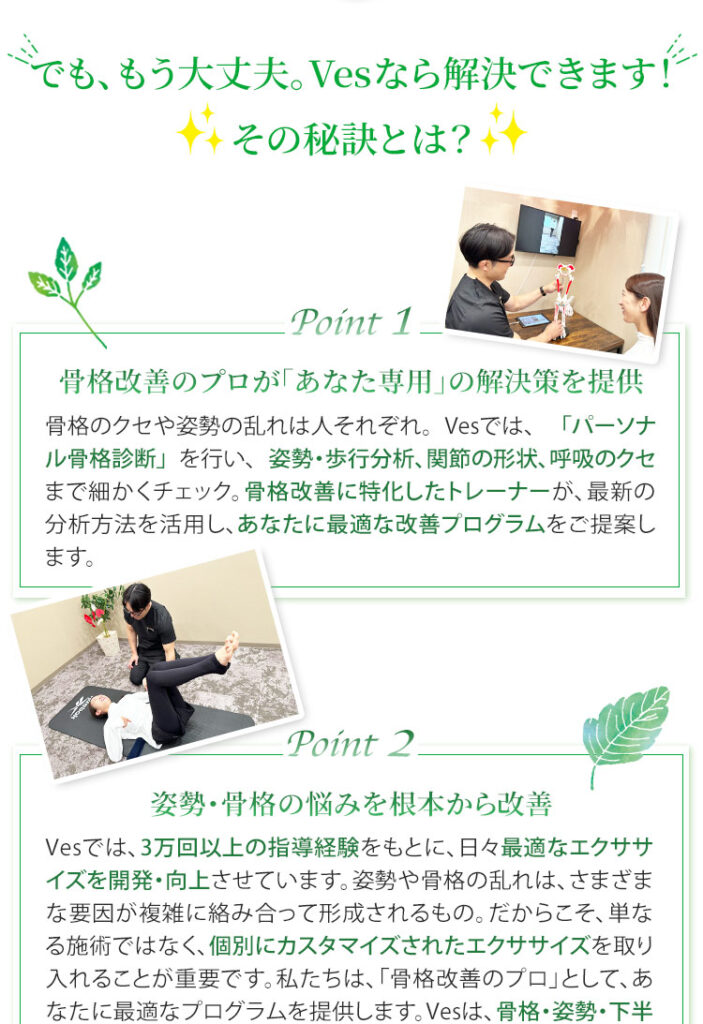 ご安心ください。Vesでは、ボキボキ鳴らすような強い矯正は行いません。骨格のバランスを整えるために、やさしい手技とストレッチを組み合わせた施術を行います。痛みが不安な方も、心地よく受けられるよう配慮しております。